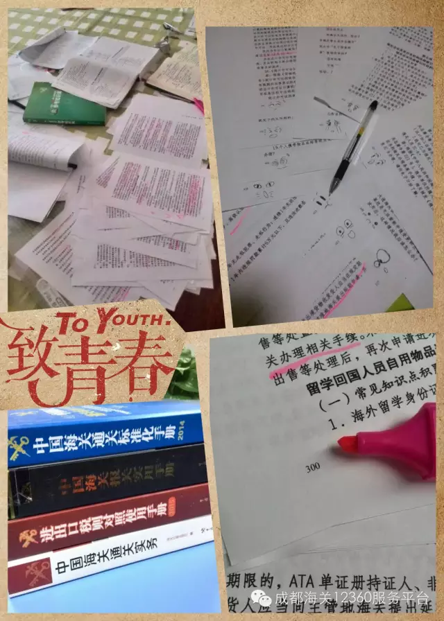 7 m( y* I1 z# F# F “12360岗位练兵”比赛是全国海关12360热线咨询员业务能力的比拼,自七月初海关总署出台练兵方案以来,我们所有的咨询员在正常接听电话为咨询者解答疑难问题的同时,利用业余时间积极备考。为了这次比赛我们参赛选手也是蛮拼的,白天看书互相抽问回答,晚上回家也不停歇,纸书太多不好带我们把知识库,各种文件下载到手机里无时无刻不在备战状态,第二天见面的第一句话竟是:“昨天你背了吗?”半夜失眠也不再数小绵羊了,直接背二十种不予免税的商品!!!