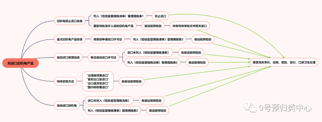 目前我国对进口旧机电产品分为三大类进行管控,通过对外公布的《重点旧机电产品目录》和《货物进口许可证发证目录》两种管理模式。 第一类:国家规定禁止进口的旧机电产品 第二类:限制进口的旧机电产品 第三类:自由进口的旧机电产品 第四类:国家特批准许入境的旧机电产品
