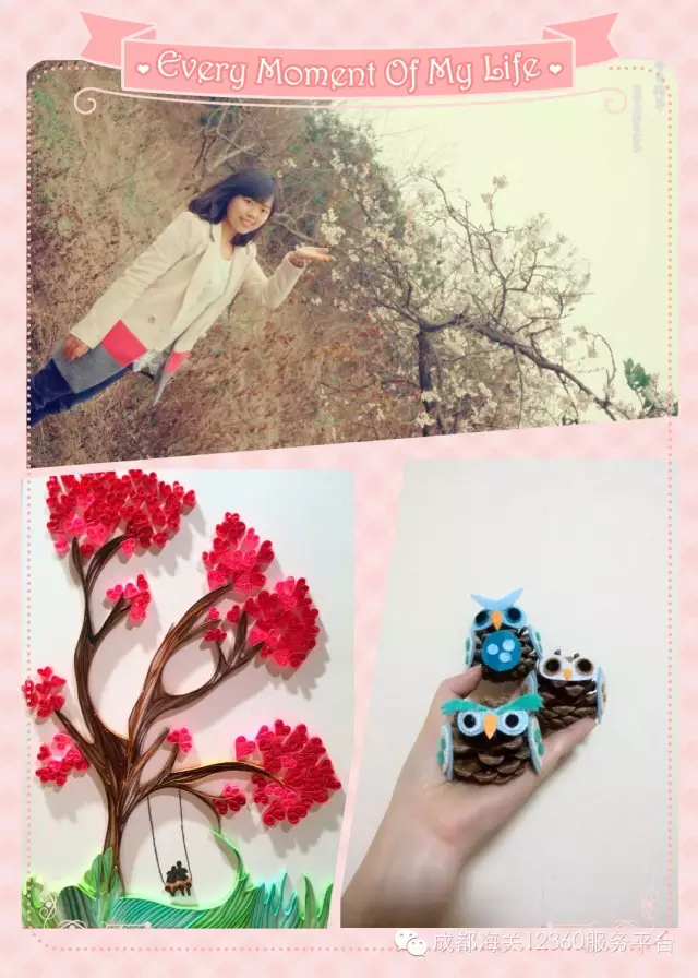 , k1 u" ?, J- Y2 W' G1 s 她说:“人生快乐的事,有点梦想实现他,有点责任勇担他”。工作上尽心尽力,热爱生活,喜欢手工艺。以后成都海关12360微信由她负责,有什么海关业务问题就找她吧!